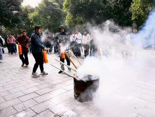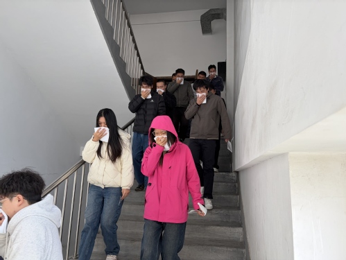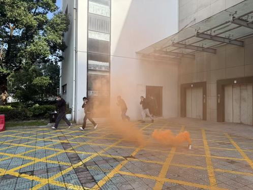 讲座结束后,全体人员在统一指挥下进行了紧急疏散和室外消防演练。王主任现场演示了消防面罩和灭火器的规范使用方法,并详细讲解了应急撤离流程。在他的指导下,多名师生及员工依次进行实操,亲身体验面罩佩戴、灭火操作及应急疏散全过程。